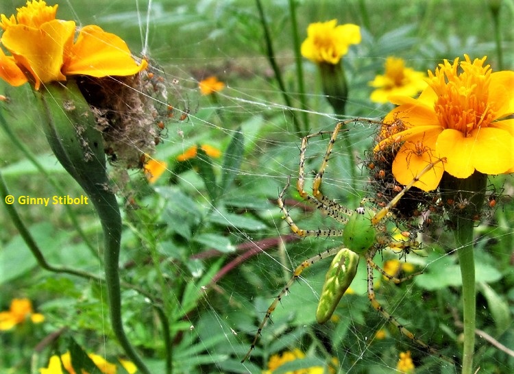 | A green lynx spider mom, spent several months in our marigolds raising her babies. The babies here are in two bunches protected under the marigold flowers with a web spun around both flowers. Read my post on the spider-mom saga. |